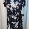 Floral black dress, cuffed sleeves, and decorative buttons on back.