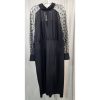 Floral black dress, cuffed sleeves, and decorative buttons on back.